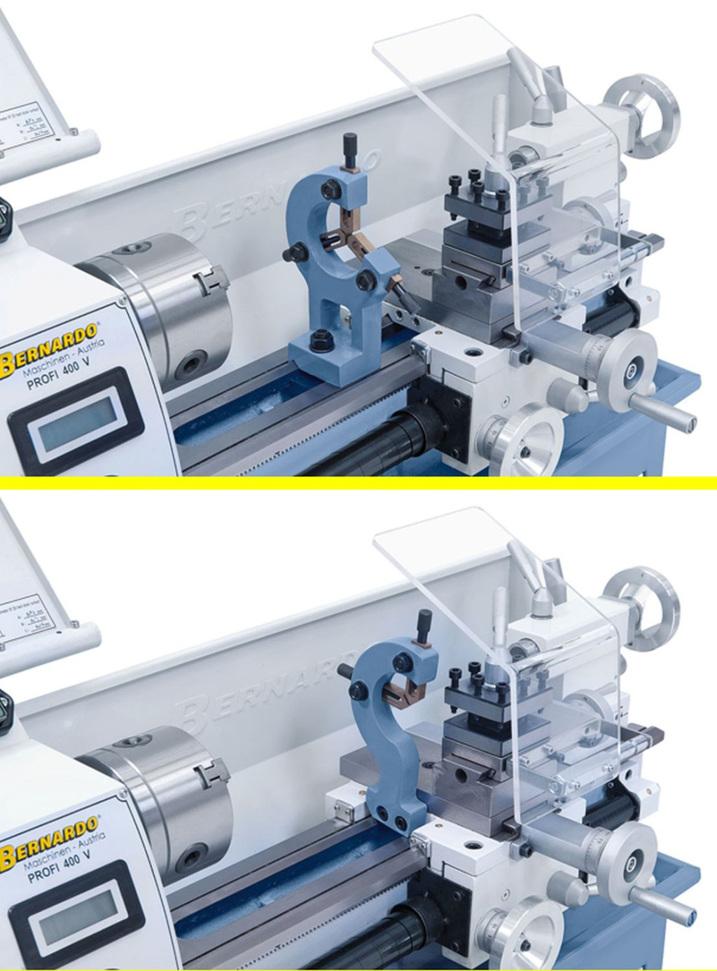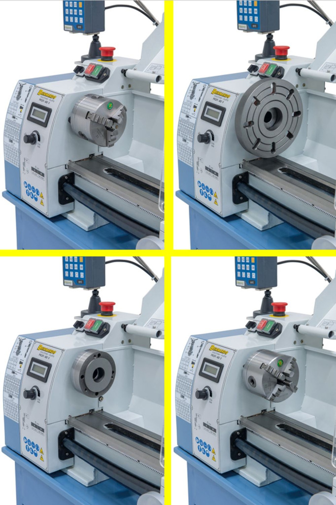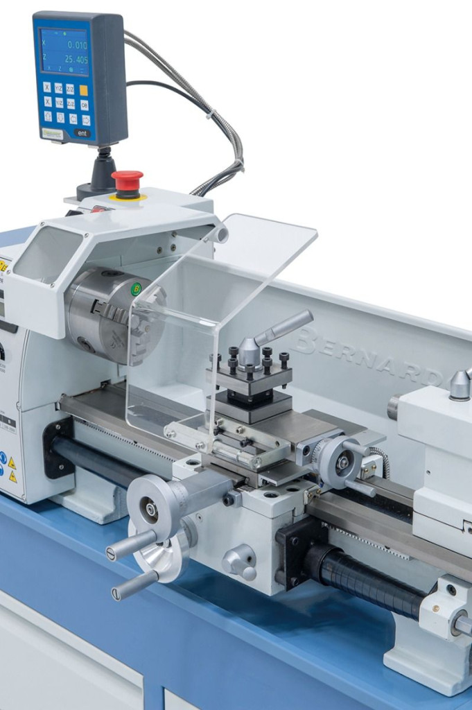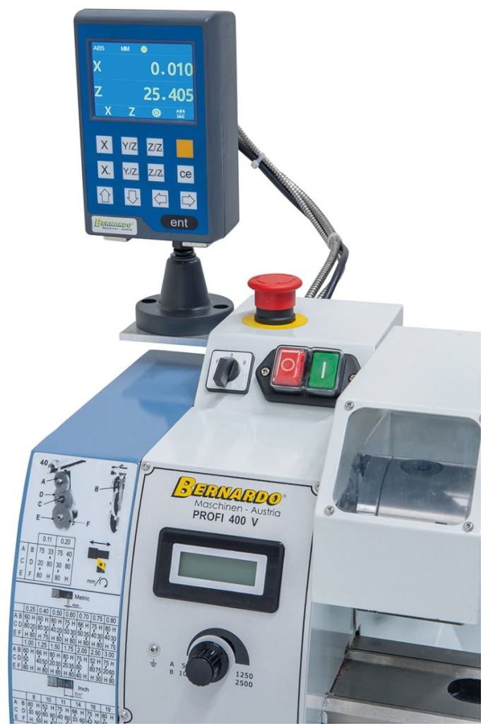 Az asztali esztergagép Profi 400 V sorozatszerűen egy fokozatmentes fordulatszám-szabályzóval van felszerelve, a beállított fordulatszám leolvasása digitális mutató segítségével történik.