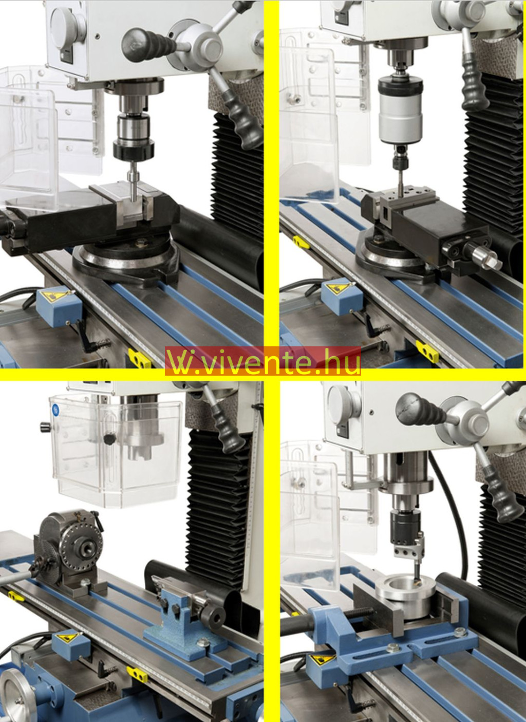 Ennek a kompakt fúró- és marógépnek a további érdekes ismertetőjelei az elektronikus, fokozatmentesen szabályozható fordulatszám, valamint az -90°-tól +90°-ig elfordítható marófej.