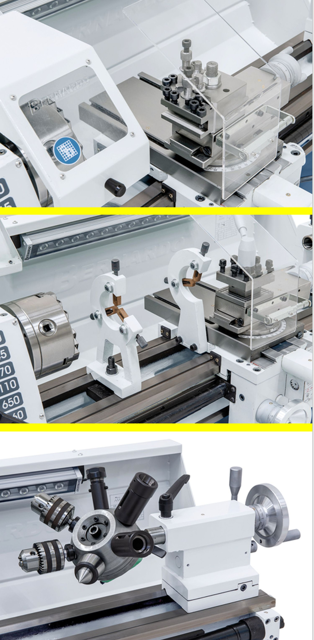 A Profi 650 G esztergagép alapfelszereltségéhez tartozik egy ólomcsavar menetvágáshoz, ill. az automatikus hosszanti- és haránt előtoláshoz.