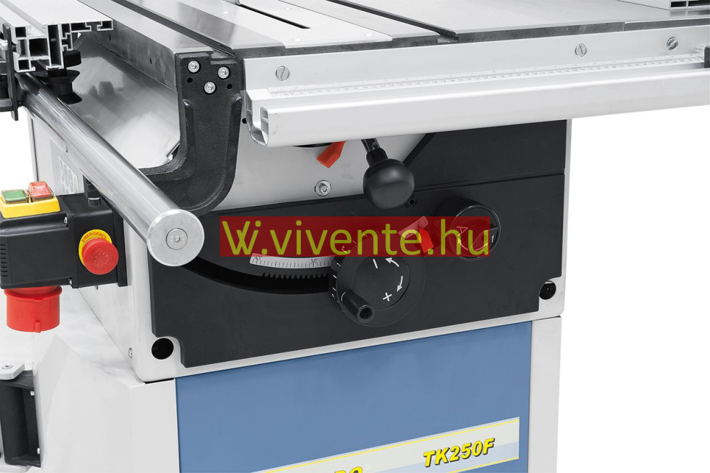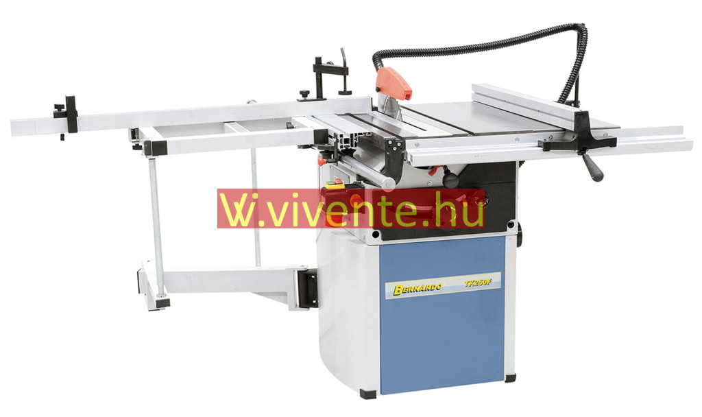 Az erős teljesítményű asztali körfűrész TK 250 F sorozatszerűen egy tolószánnal, inkluzív szélezőkerettel és vonókörfűrész-berendezéssel felszerelt.