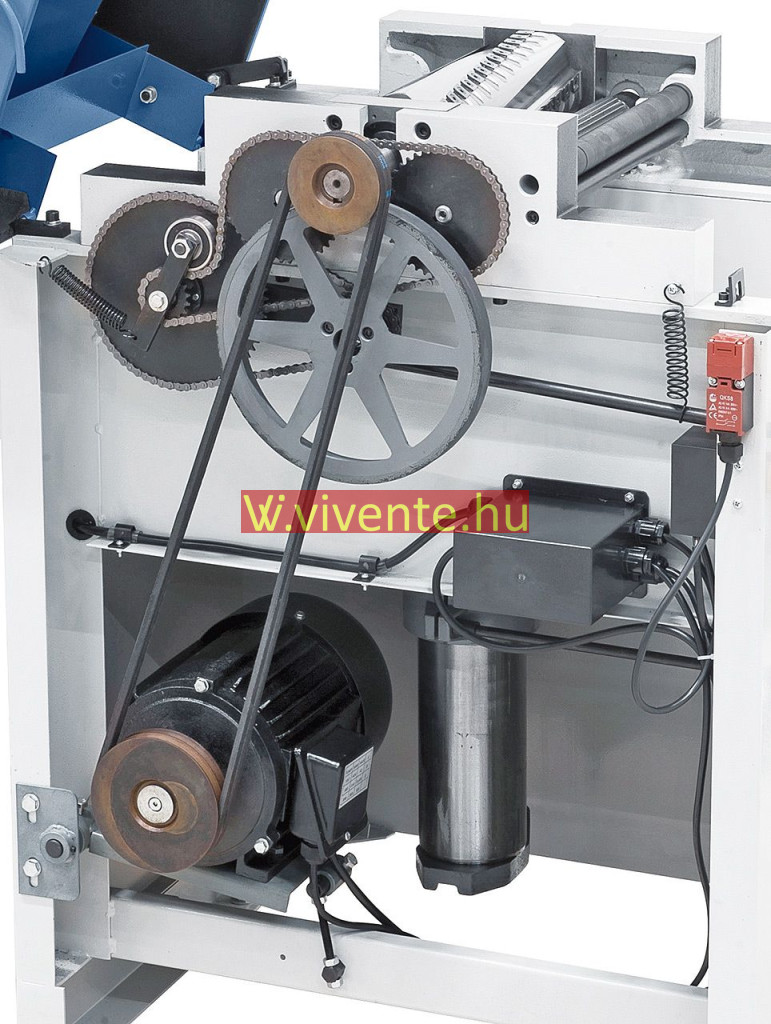 Számos védőberendezéssel: BE-Ki-kapcsoló alacsony feszültség kioldóval, végálláskapcsoló véletlen bekapcsolás ellen, vész-ki kapcsolóval.