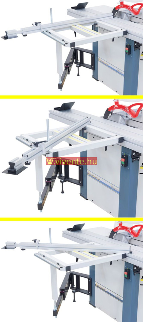 Kihúzható teleszkópos ütköző (2260 mm-ig) a kinyúló-asztalra előre és hátra felszerelhető, fokozatmentesen elfordítható 90° -tól 45° -ig