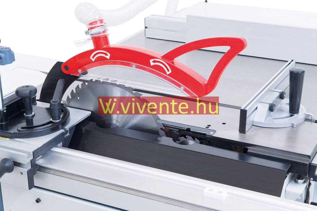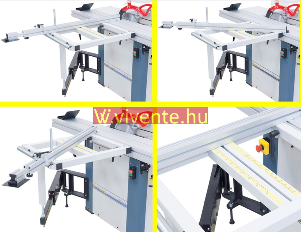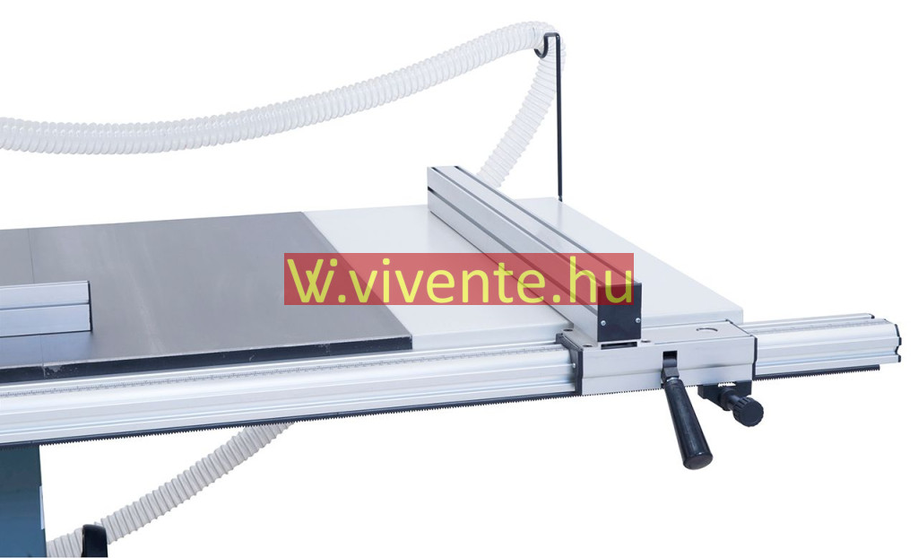 Kihúzható teleszkópos ütköző (2260 mm-ig) a kinyúló-asztalra előre és hátra felszerelhető, fokozatmentesen elfordítható 90° -tól 45° -ig