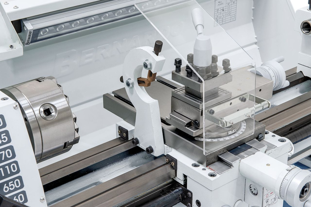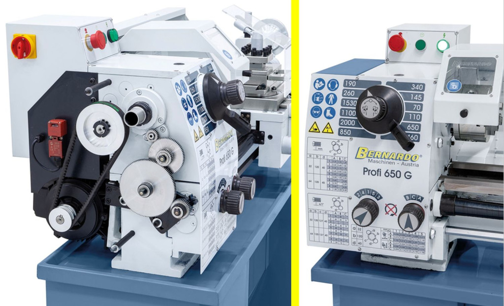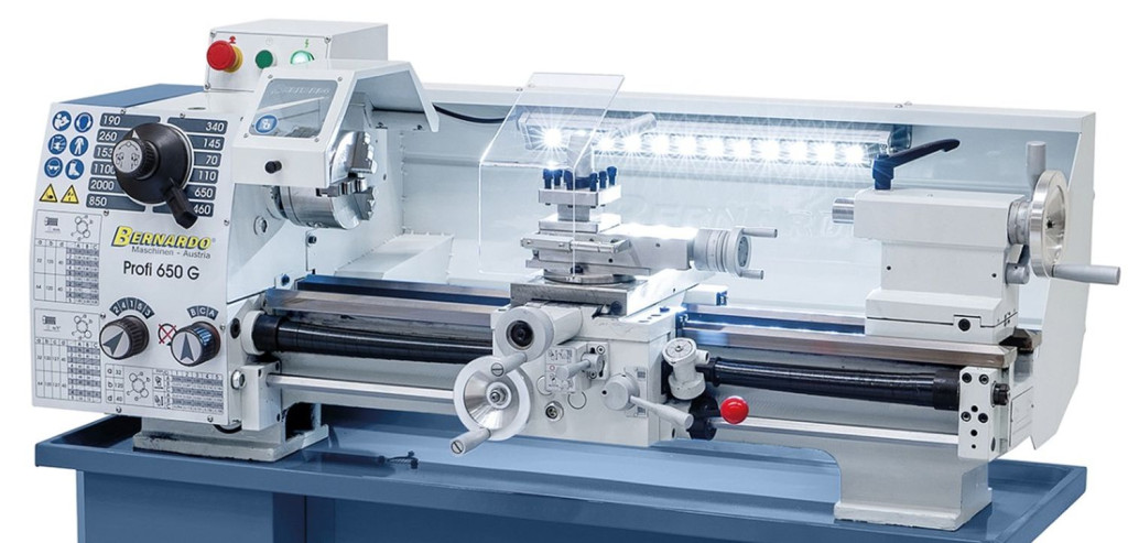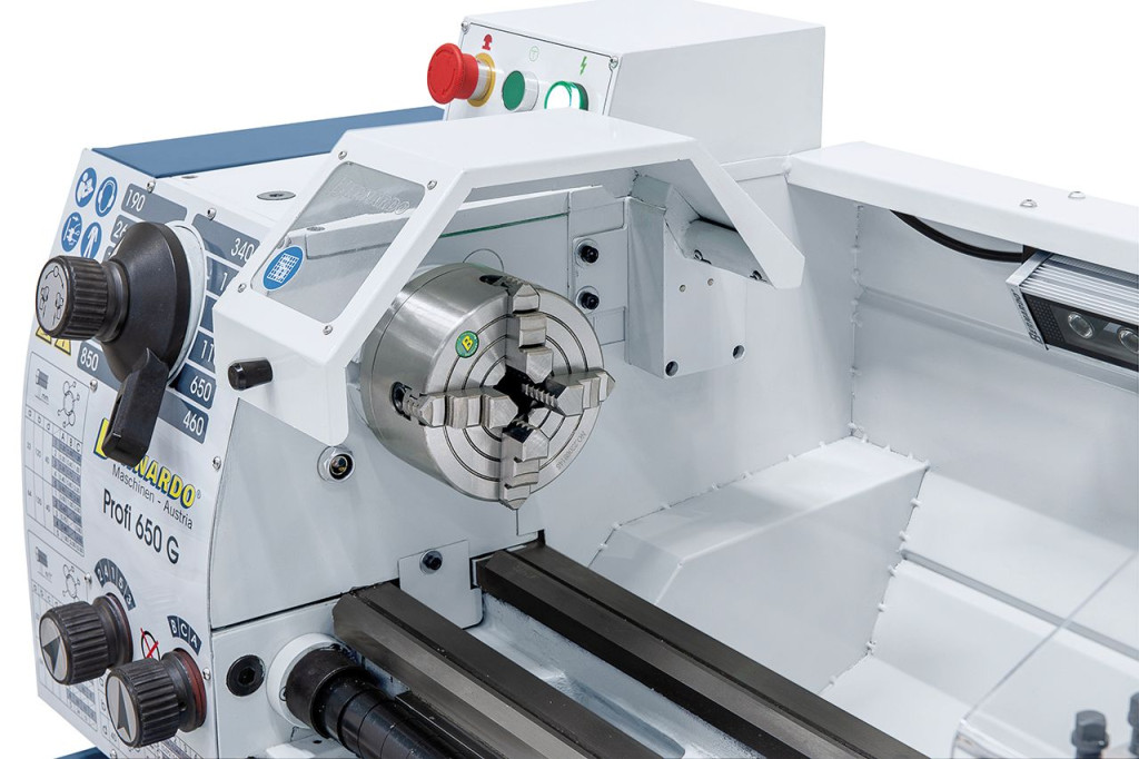 A Profi 650 G esztergagép alapfelszereltségéhez tartozik egy ólomcsavar menetvágáshoz, ill. az automatikus hosszanti- és haránt előtoláshoz.