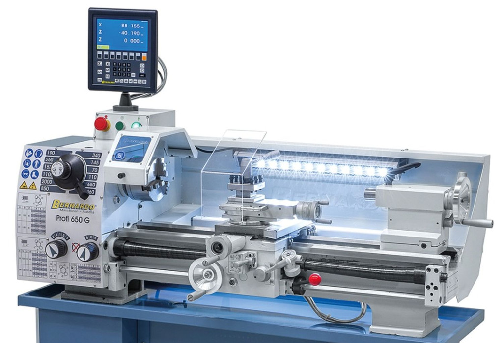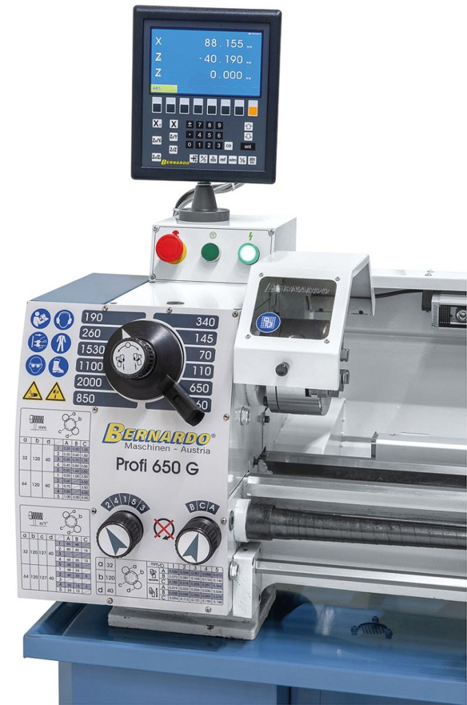 A Profi 650 G esztergagép alapfelszereltségéhez tartozik egy ólomcsavar menetvágáshoz, ill. az automatikus hosszanti- és haránt előtoláshoz.