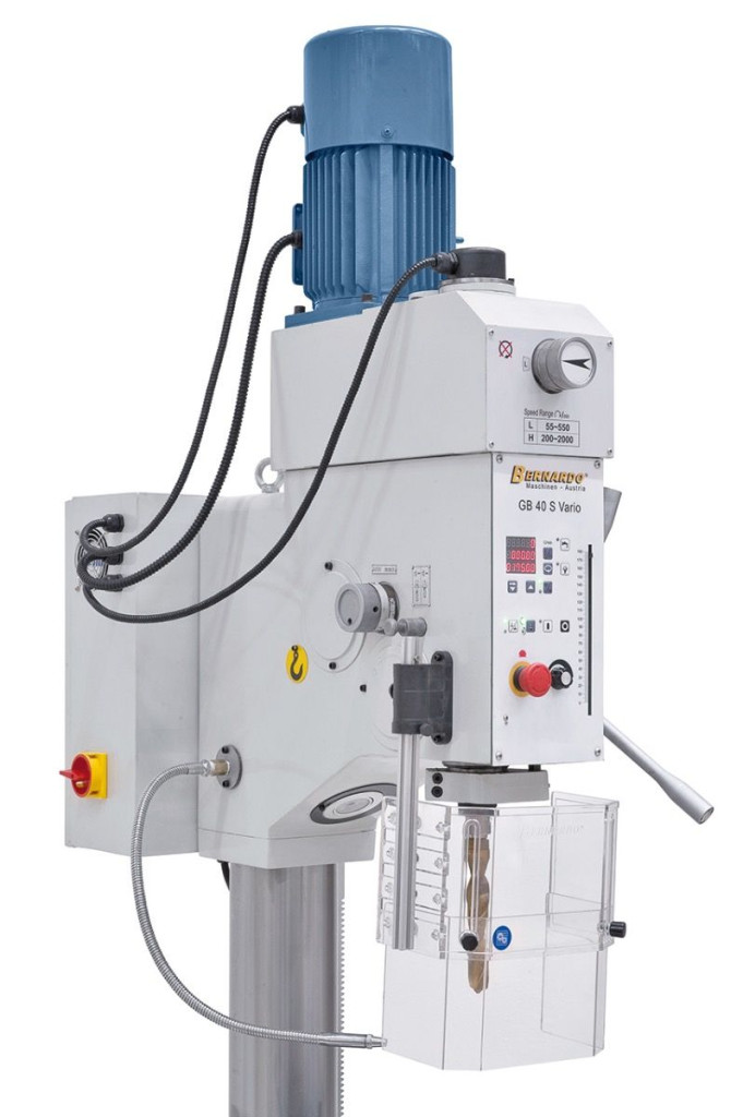 A GB 40 S Vario nehéz hajtóműves fúrógép fokozatmentes fordulatszám-szabályzóval, automatikus szegnyereg előretolóval és digitális fordulatszám kijelzővel.