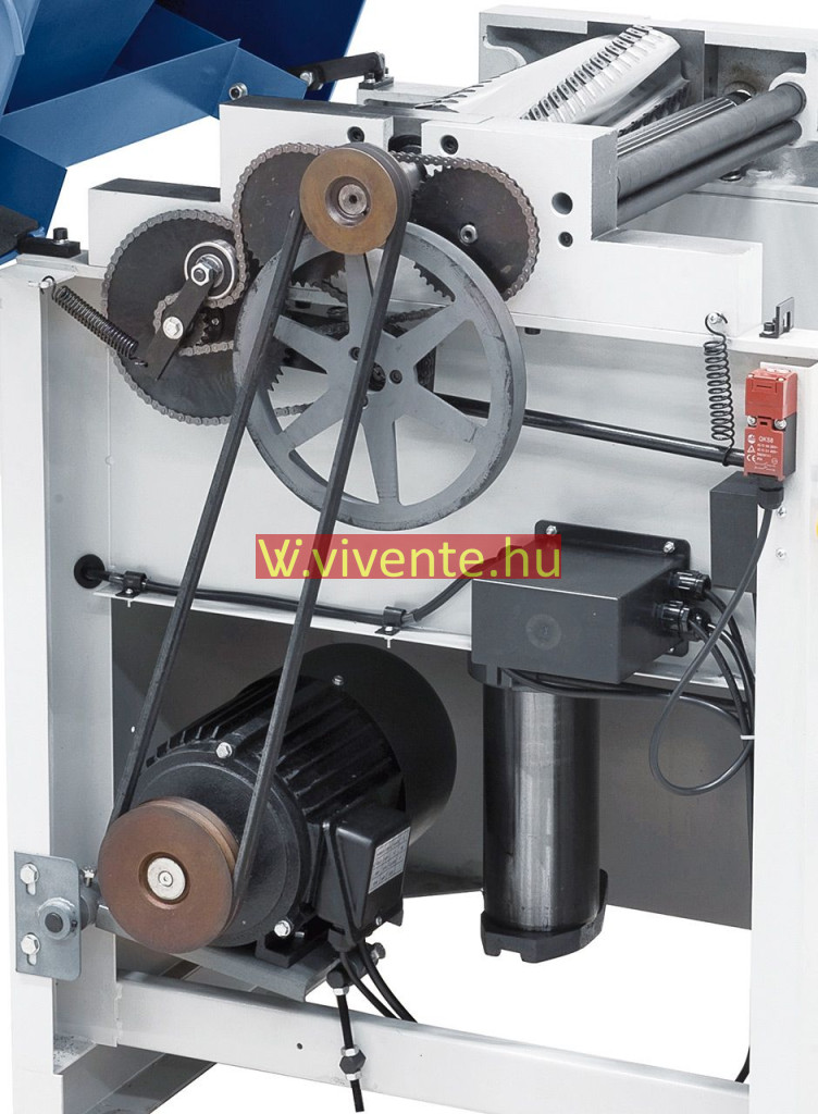 Számos védőberendezéssel: BE-Ki-kapcsoló alacsony feszültség kioldóval, végálláskapcsoló véletlen bekapcsolás ellen, vész-ki kapcsolóval.