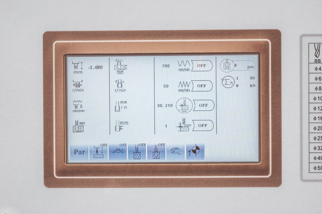 A szériavezérlés a szerszám átmérője és az anyag (öntvény / acél) megadása után kiszámítja az ideális fordulatszámot, illetve az előtolási sebességet fúrásnál és menetfúrásnál