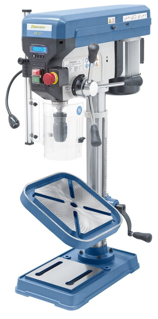Elfordítható fúróasztal (± 45°), magasság beállítása fogasléc által