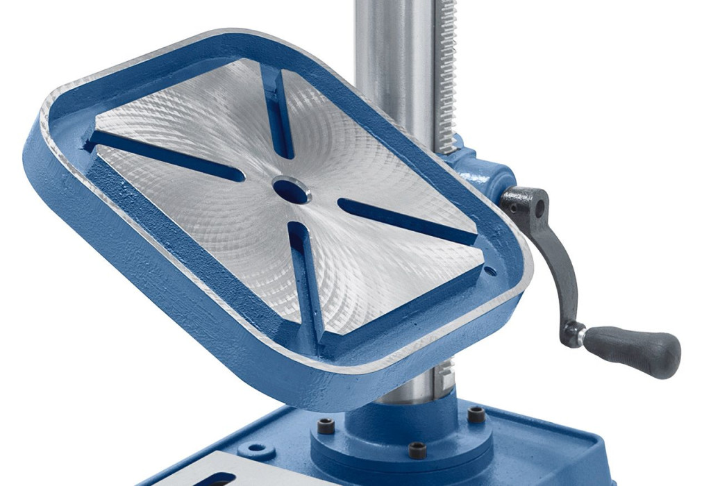 Elfordítható fúróasztal (± 45°), magasság beállítása fogasléc által