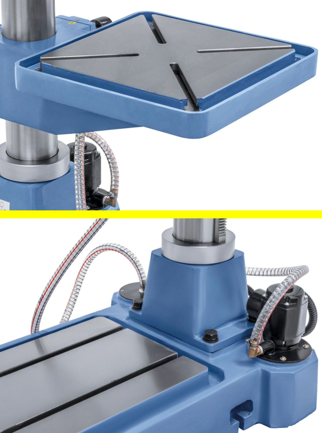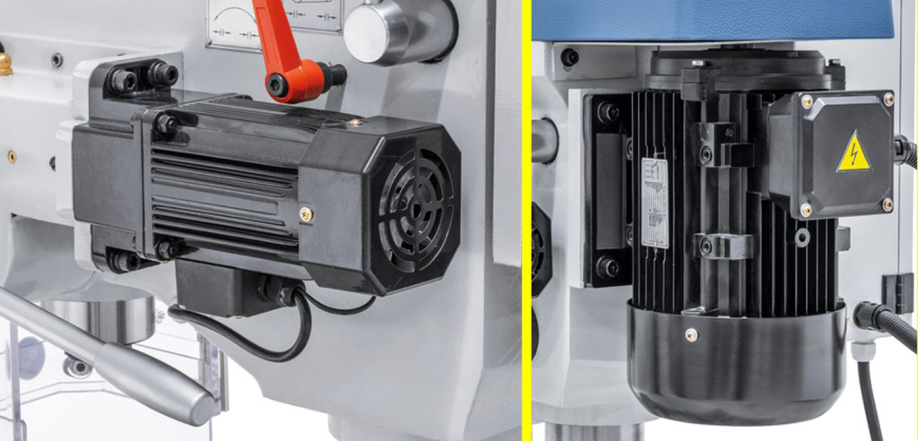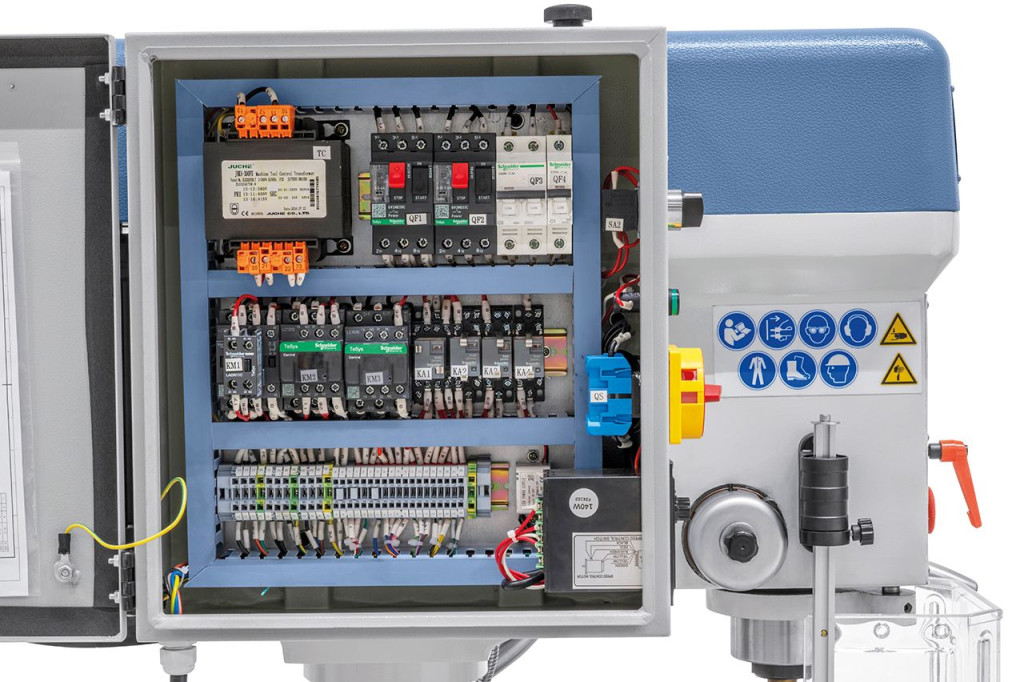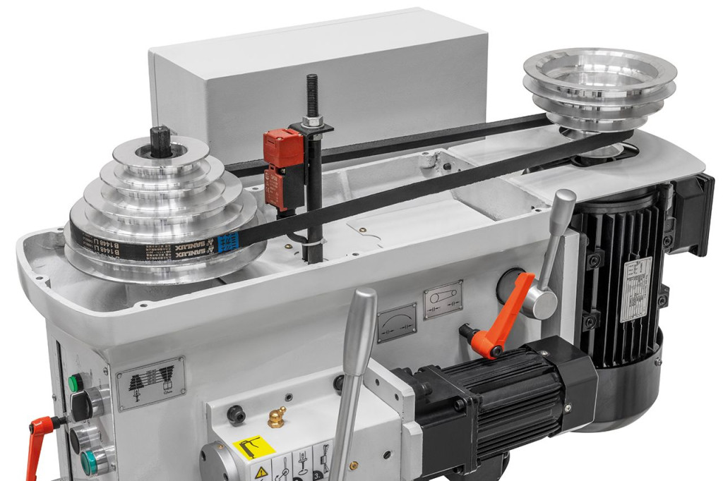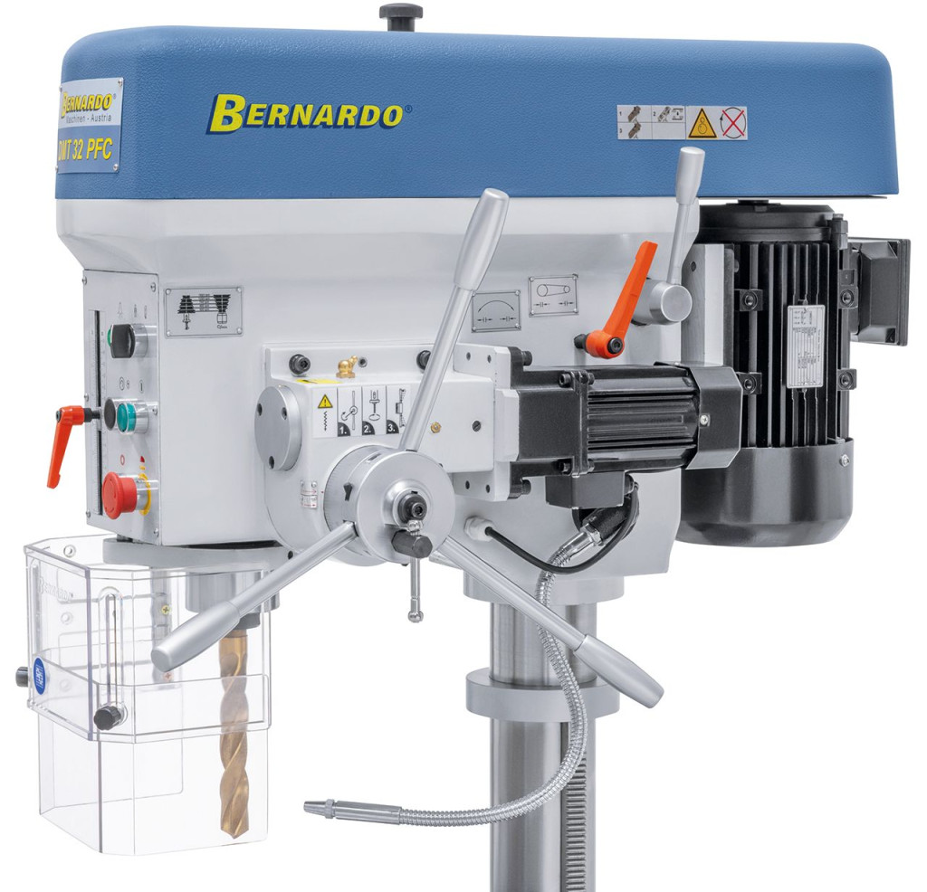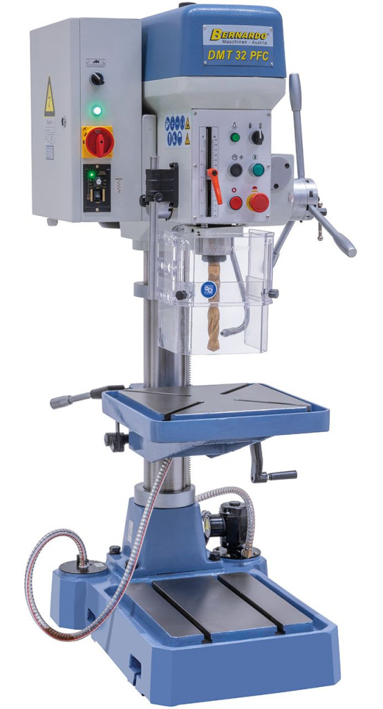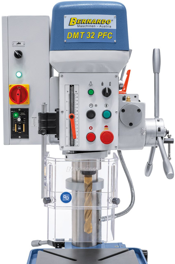 A DMT 32 PFC asztali fúrógép alapfelszereltségként menetvágó berendezéssel és automatikus fúróelőtolással van felszerelve.