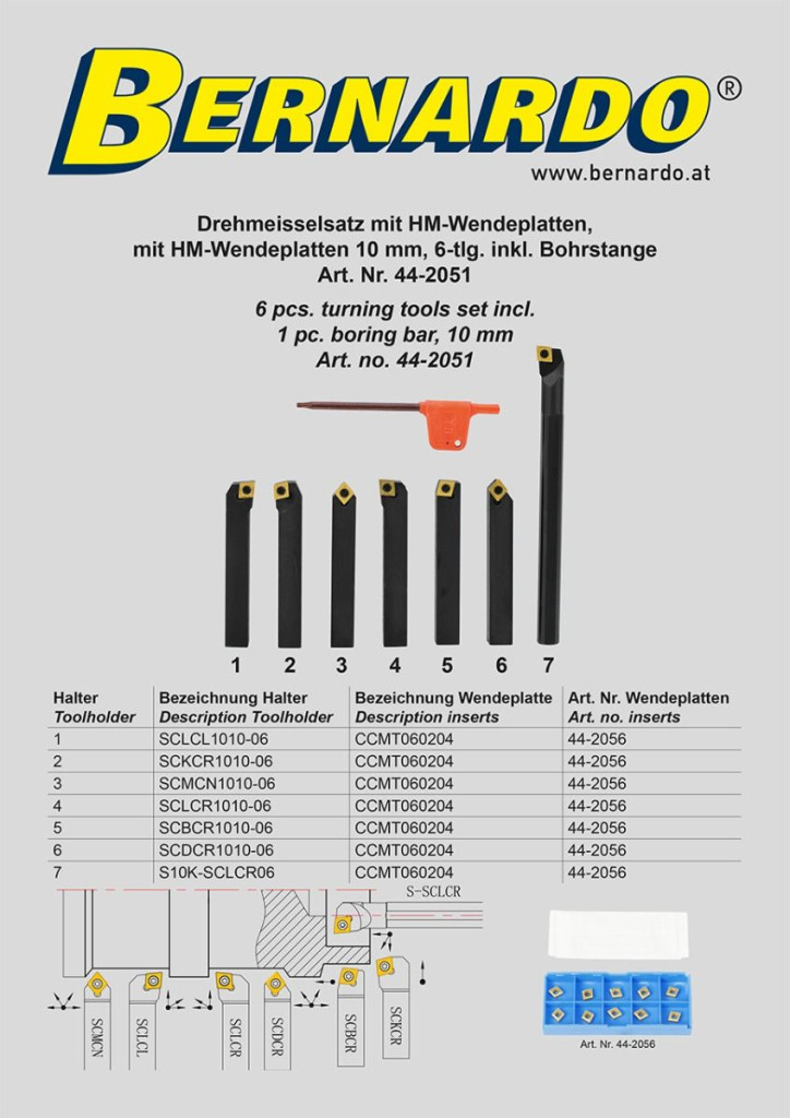 Bernardo Esztergavéső-tétel HM-fordító-vágólapokkal 10 mm, 6-részes inkl. fúrórúd, 44-2051.